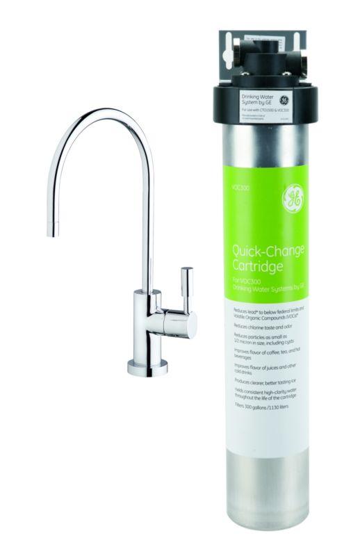 GE VOC300 Starter Kit is a water purifier that uses Micro-Pure® Filter Technology. Exclusive Micro-Pure® filtering material coats the entire pleated surface inside the cartridge—removes particles 1/2 micron (1/50,000 of an inch) and larger for the entire life of the cartridge.